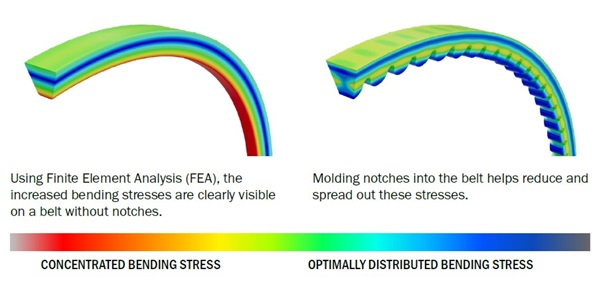 When space is at a premium, drives are often designed with small pulleys. Notched belts excel by reducing the bending stress and heat generation while extending belt life.